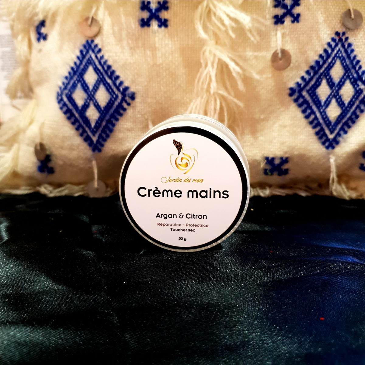 La crème est à l’huile d’Argan, d'amande douce, de beurre de Karité et d'huile essentielle de Citron répare les mains abîmées et laisse sur votre peau un agréable parfum.